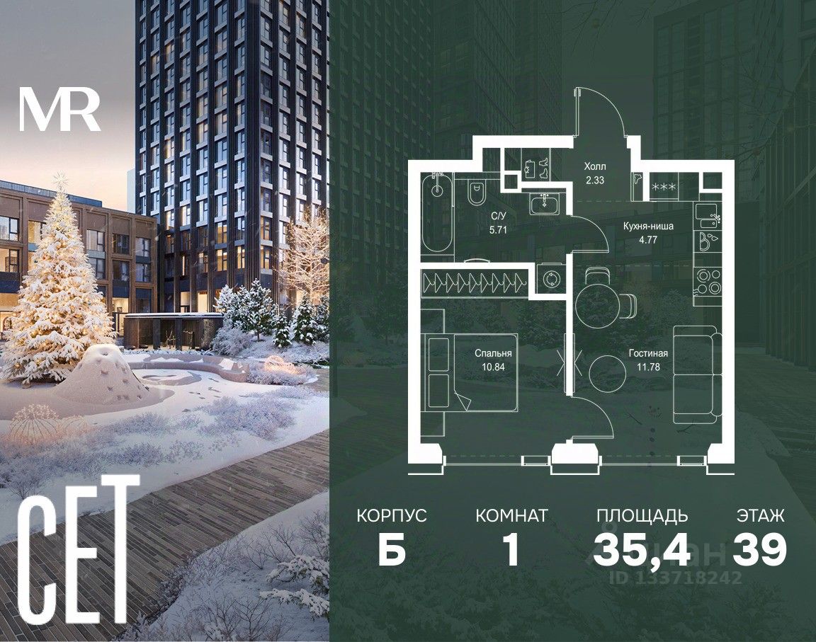 В ЖК Сет продается 1-комнатная квартира площадью 35.43 м², расположенная в корпусе Б, на 39 этаже 59 этажного дома.