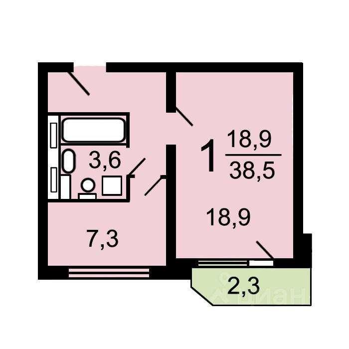 Общая площадь: 37,7 кв.м.