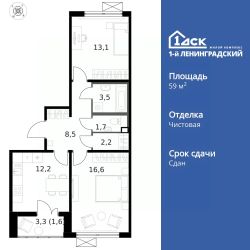 Продаётся 2-к квартира номер 493 общей площадью 59.4 кв.м. на 11-м этаже 12 этажного здания. Чистовая отделка. Цена с учётом скидки.