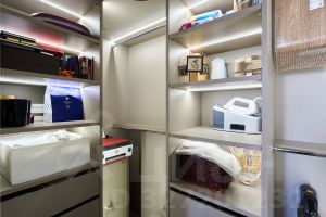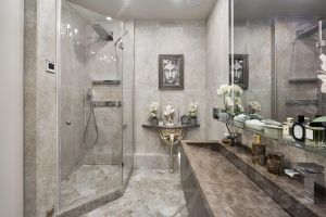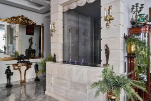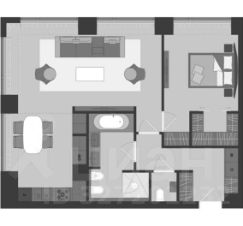 Планировка квартиры: просторная гостиная с панорамными окнами, выходящими на парковую зону и озеро с фонтаном, выделенной обеденной зоной и кухней, каминной зоной сделанной по индивидуальному заказу из камня Травертин с встроенным ТВ и биокамином, спальная комната оснащённая гардеробной с отдельным светом, прихожая с встроенной системой хранения вещей из черного стекла, два санузла. В основном санузле ванна Villeroy & Boch Oberon 1800 * 800 мм с гидромассажем, над ванной телевизор в зеркале с встроенными колонками и объёмным звуком, маркиза с электроприводом, сантехника Hansgrohe, умный унитаз Roca, душевая кабина с доп. опциями. В гостевом санузле уникальная раковина с посеребрённым смесителем (Франция, начало 19 века), умный унитаз Roca.