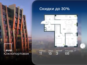 В северной части района Печатники продается 3-комнатная квартира площадью 68.00 кв.м без отделки. Квартира расположена на 16 этаже 16-этажного корпуса 11 в жилом комплексе комфорт-класса Левел Южнопортовая (компания Level Group/Левел групп).