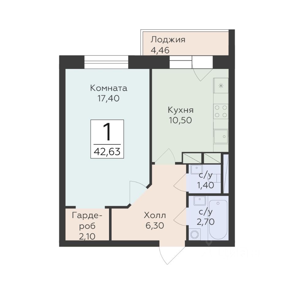 Продается 1-к квартира площадью 42.63 кв. м с черновой отделкой. Квартира расположена на 6 этаже 19 этажного дома, в 201 корпусе.