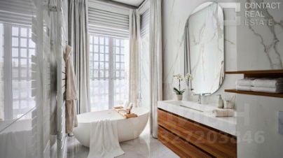 - Мастер-спальня 17 м² с гардеробной 9 м² и собственной ванной с красивой ванной и большими окнами в пол