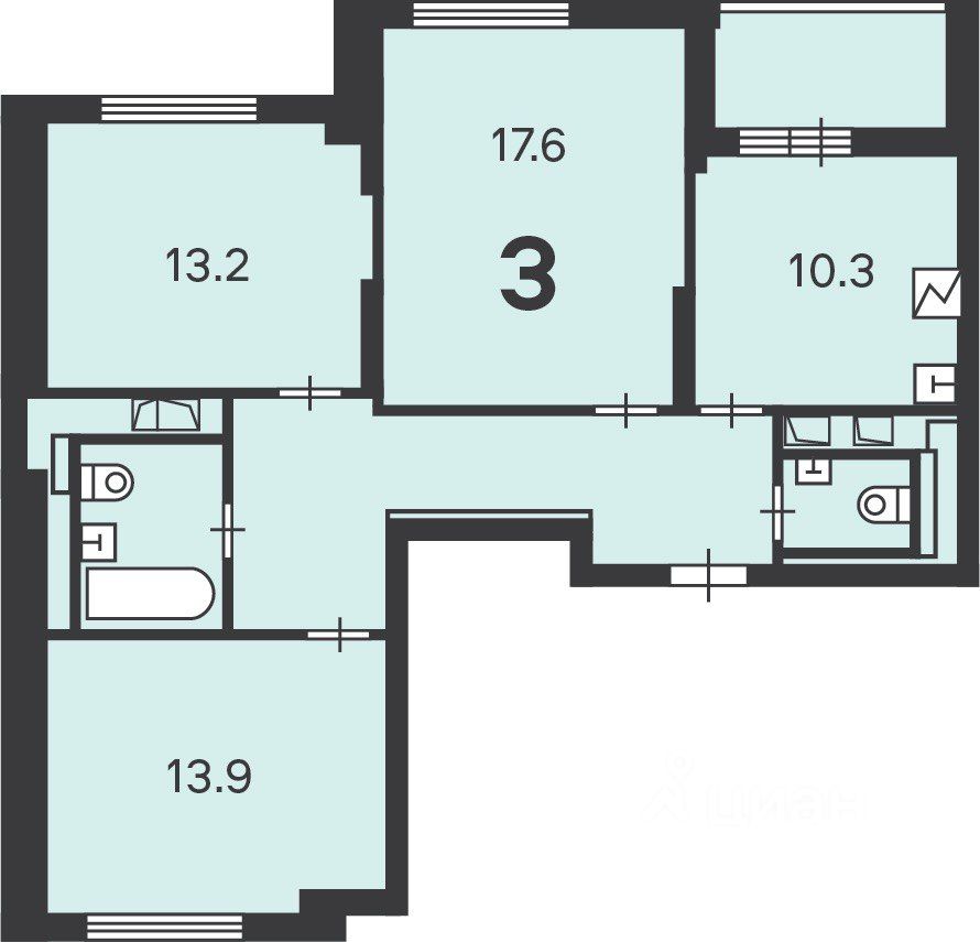 • три просторные комнаты, правильной формы, два санузла. Просторная кухня площадью 11 кв. м