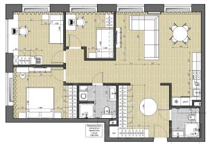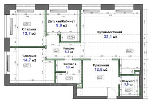 Планировка: кухня-гостиная, три изолированные комнаты, два полноценных санузла, просторный холл и коридор, общая площадь по ЕГРН - 100,8 кв.м. Широкие панорамные окна до пола обеспечивают великолепные виды на окружающий пейзаж, на парки и пойму Москвы-реки.