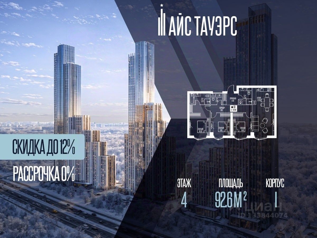 Выгода 12%, беспроцентная рассрочка от застройщика. Продается 3-комнатная квартира на 4 этаже, 92.6 кв.м. площади в жилом комплексе "Айс Тауэрс", который расположен в Западном административном округе Москвы. Архитектура комплекса отличается панорамным остеклением фасадов.
