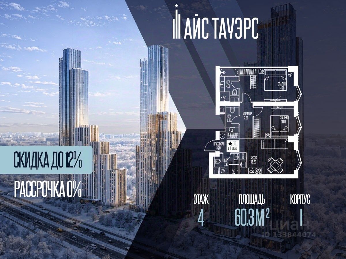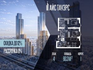 Выгода 12%, беспроцентная рассрочка от застройщика. Продается 2-комнатная квартира на 4 этаже, 60.3 кв.м. площади в жилом комплексе "Айс Тауэрс", который расположен в Западном административном округе Москвы. Архитектура комплекса отличается панорамным остеклением фасадов.