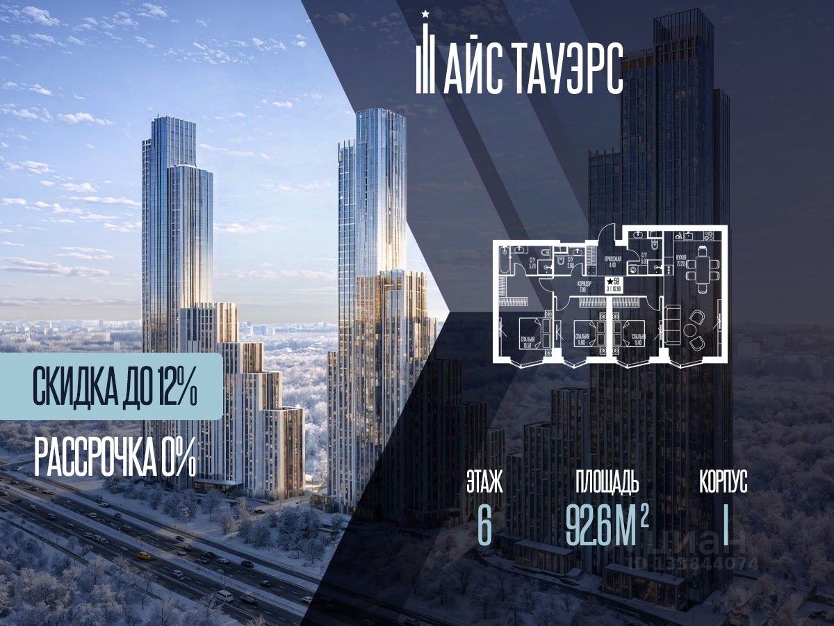 Выгода 12%, беспроцентная рассрочка от застройщика. Продается 3-комнатная квартира на 6 этаже, 92.6 кв.м. площади в жилом комплексе "Айс Тауэрс", который расположен в Западном административном округе Москвы. Архитектура комплекса отличается панорамным остеклением фасадов.