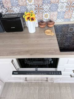 Просторная кухня с современной бытовой техникой. Микроволновая печь, духовой шкаф, варочная панель, посудомоечная машина, кондиционер. Места на кухне хватает для всей дружной семьи.