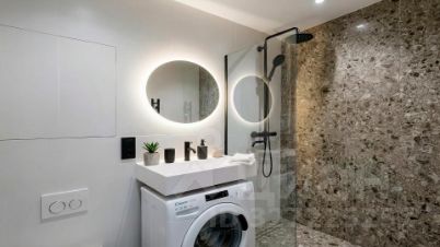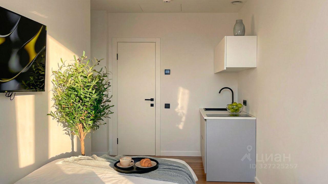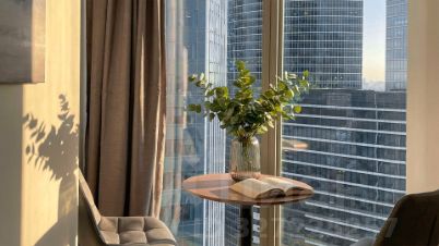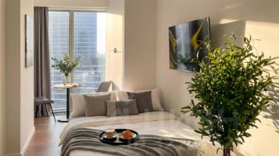 Апартаменты площадью 20 м² с дизайнерской отделкой в светлых тонах. Пространство полностью укомплектовано мебелью и бытовой техникой — готово для жизни и сдачи в аренду. Панорамные окна открывают виды на башни "Москва-Сити" и город.