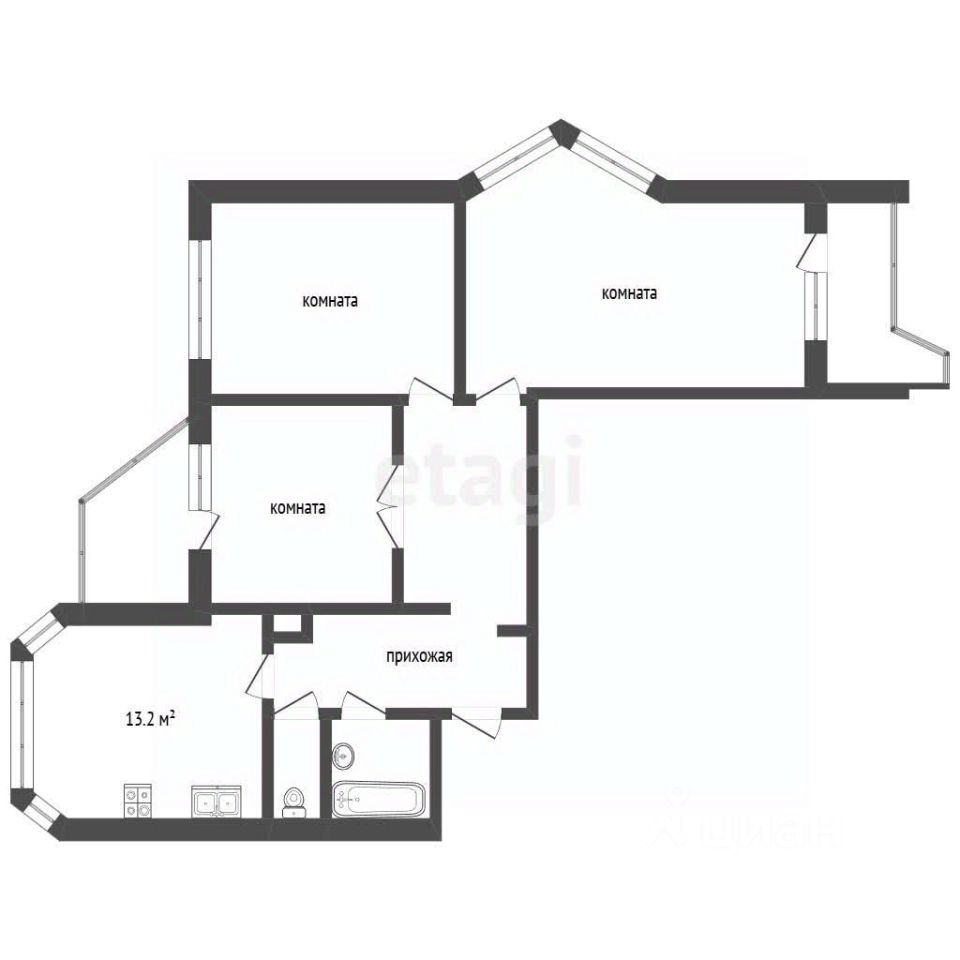 Квартира расположена на 3 этаже. Дом построен в 2000 году. Общая площадь квартиры составляет 89 кв. м, жилая — 44,9 кв. м, площадь кухни — 13,2 кв. м. Высота потолков — 2,75 м. Комнаты изолированные: 19,7 кв. м, 14, 1 кв. м и 11,1 кв. м. Окна во двор. Санузел раздельный.