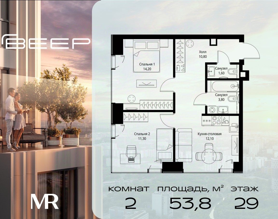 Продаётся 2-комнатная квартира общей площадью 53.80 м² с предчистовой отделкой в ЖК Веер на 29-м этаже 46 этажного дома.