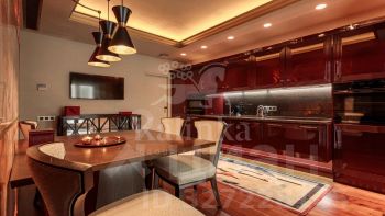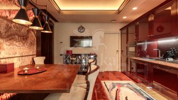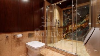 Дизайн выполнен в стиле ар-деко. Мебель во всей квартире от американского дизайнера Барбары Барри, интерьеры которой являются воплощением самой сути американского дизайна: лаконичного и элегантного, утонченного, но простого. Мебель изготовлена из американского ореха. Кухня итальянского бренда Brummel с встроенной техникой премиальных марок Liebherr и Kuppersbusch. Особую уникальность кухне придает слэб из оникса с подсветкой. Стену в первом санузле оформили слэбом под названием "Ван Гог", который действительно очень похож на вангоговское полотно с жёлтыми, зелёными и голубыми цветами. Во втором санузле выбрали мрамор Чиполло с серыми, коричневыми и пудрово-розовыми разводами.