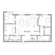 Планировка: кухня, просторная гостиная с обеденной зоной (53 кв. м), мастер-спальня с собственной гардеробной комнатой и ванной, вторая спальня (или рабочий кабинет), ванная комната, гостевой санузел и постирочный блок.