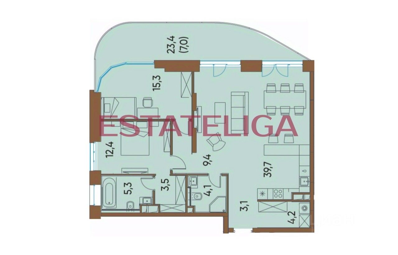 Функциональная планировка квартиры: просторная кухня-гостиная с выходом на террасу, мастер-спальня с гардеробной зоной и санузлом с окном, вторая спальня/кабинет, второй санузел с душевой кабиной, просторный холл с гардеробной зоной.