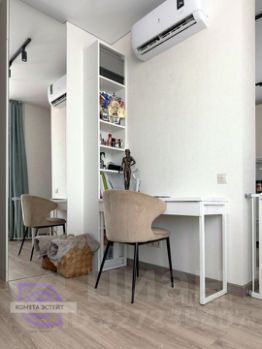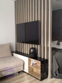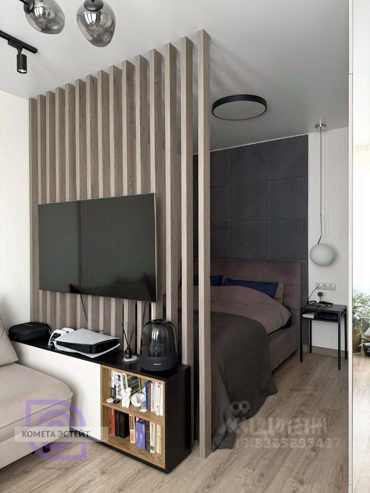 Комната (20 кв. м): Просторное помещение с функциональным зонированием. Удачно выделена зона спальни, организована удобная система хранения, есть рабочий стол и стеллаж. Диван трансформируется в полноценное двуспальное место для гостей.