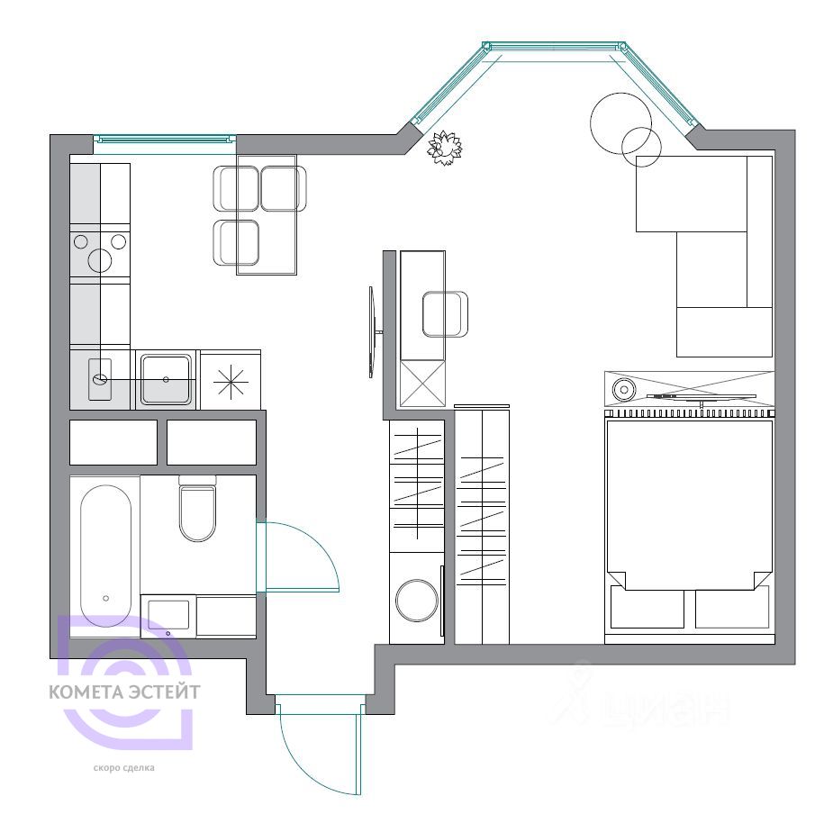 Эркерное окно: Главная архитектурная особенность квартиры. Благодаря ему комната наполнена светом и воздухом с утра до вечера. Весной и летом из окна открываются невероятные закаты — палитра красок каждый вечер будет радовать вас.