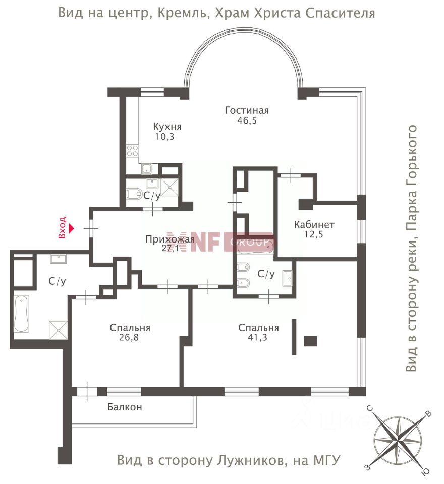 Окна ориентированы на 3 стороны: открывается красивый вид в сторону храма Христа Спасителя, Лужников и МГУ.