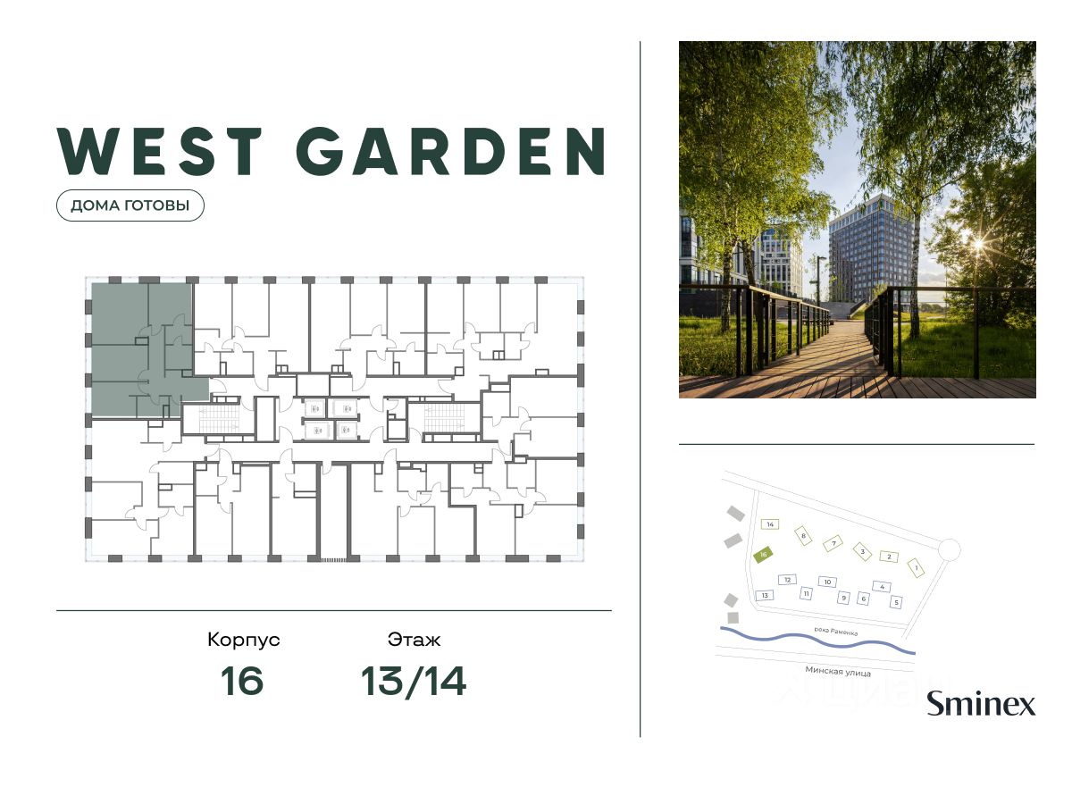 West Garden - это собрание клубных домов высотой 12-14 этажей в собственном парке 16 гектаров вдоль реки. Просторный среднеэтажный квартал расположен на Минской улице, в респектабельном Западном округе столицы. Вокруг премиальное окружение и более 1000 гектаров парков.