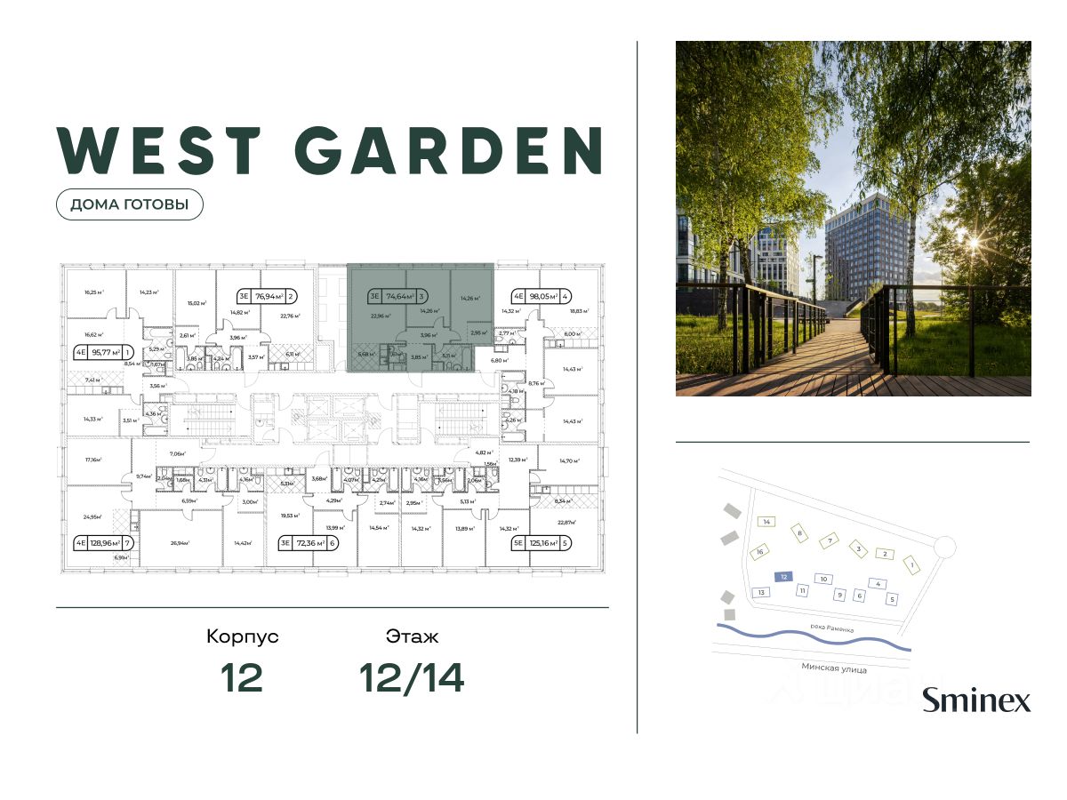 West Garden - это собрание клубных домов высотой 12-14 этажей в собственном парке 16 гектаров вдоль реки. Просторный среднеэтажный квартал расположен на Минской улице, в респектабельном Западном округе столицы. Вокруг премиальное окружение и более 1000 гектаров парков.