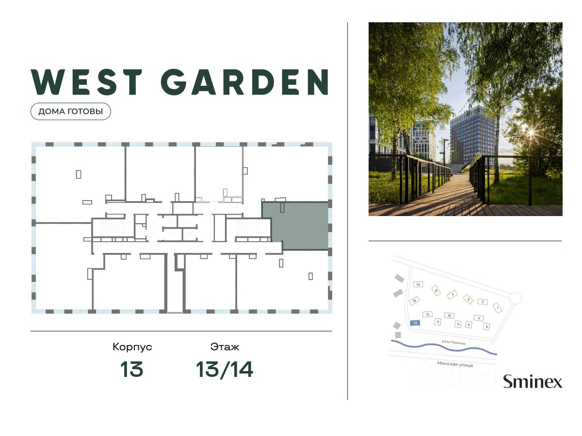 West Garden - это собрание клубных домов высотой 12-14 этажей в собственном парке 16 гектаров вдоль реки. Просторный среднеэтажный квартал расположен на Минской улице, в респектабельном Западном округе столицы. Вокруг премиальное окружение и более 1000 гектаров парков.