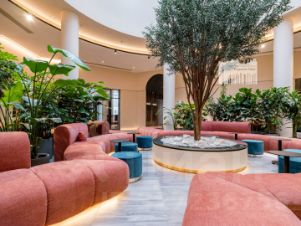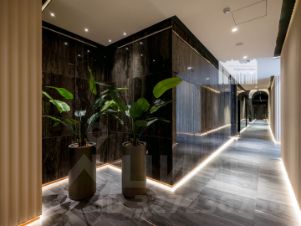 Шикарный холл с зимнем садом, переговорными, отдельная комната для корреспонденции, место для коворкинга, санузлы, колясочные, лапомойки, детская игровая комната