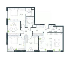 Эта просторная квартира площадью 104,3 кв. м с отделкой White Box станет идеальным холстом для воплощения вашего авторского дизайна. Планировочное решение продумано до мелочей и включает в себя три изолированные спальни, три санузла и светлую кухню-гостиную, которая станет центром притяжения для всей семьи. Главной особенностью квартиры являются высокие потолки и панорамное остекление в пол на две стороны света, что обеспечивает превосходную инсоляцию и открывает захватывающие виды на Москва-реку.