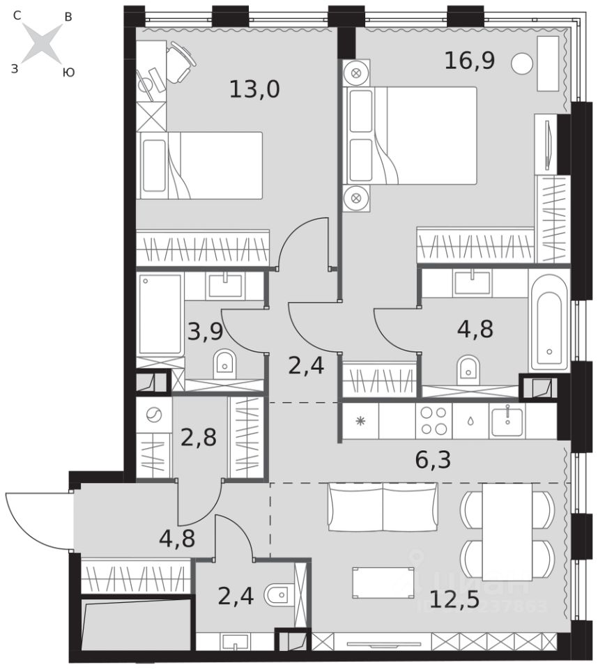 - Мастер-зона с санузлом. Уют и комфорт в одном пространстве.