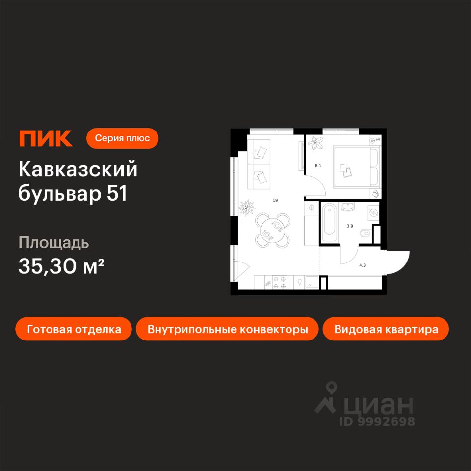 Продаётся 1-комн. квартира площадью 35,3 кв.м на 24 этаже 32 этажного дома (Корпус 3.6, Секция 3) проекта ПИК Кавказский бульвар 51. Светлый просторный подъезд на уровне земли, функциональная планировка, большие окна, c отделкой.