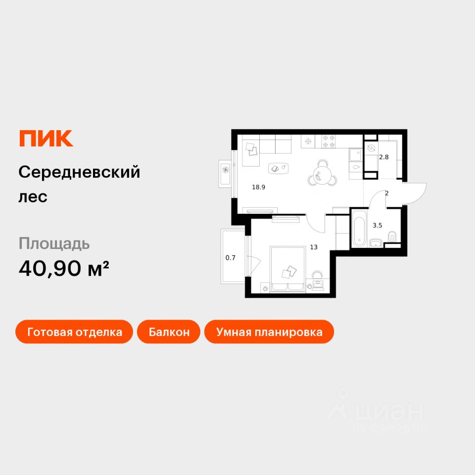 Продаётся 1-комн. квартира площадью 40,9 кв.м на 6 этаже 16 этажного дома (Корпус 2.1.1, Секция 1) проекта ПИК Середневский лес. Светлый просторный подъезд на уровне земли, функциональная планировка, большие окна, c отделкой.