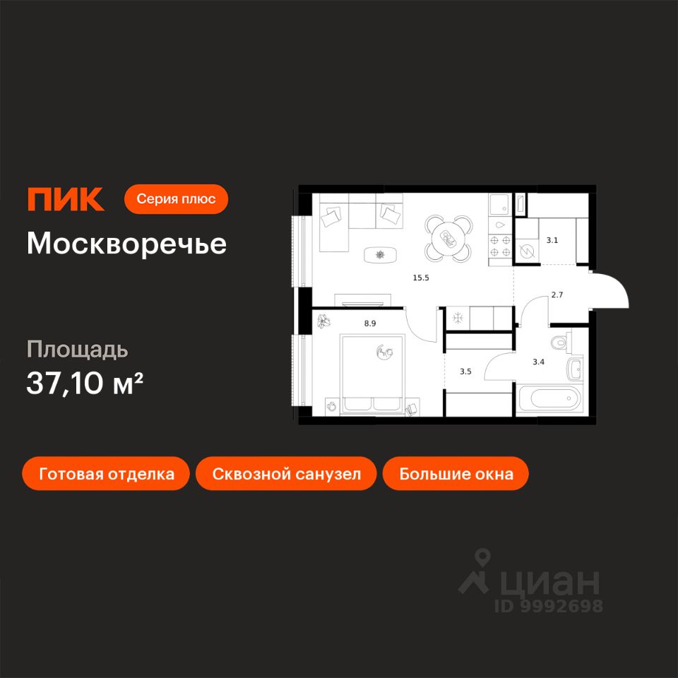 Продаётся 1-комн. квартира площадью 37,1 кв.м на 14 этаже 17 этажного дома (Корпус 1.2, Секция 3) проекта ПИК Москворечье. Светлый просторный подъезд на уровне земли, функциональная планировка, большие окна, c отделкой.