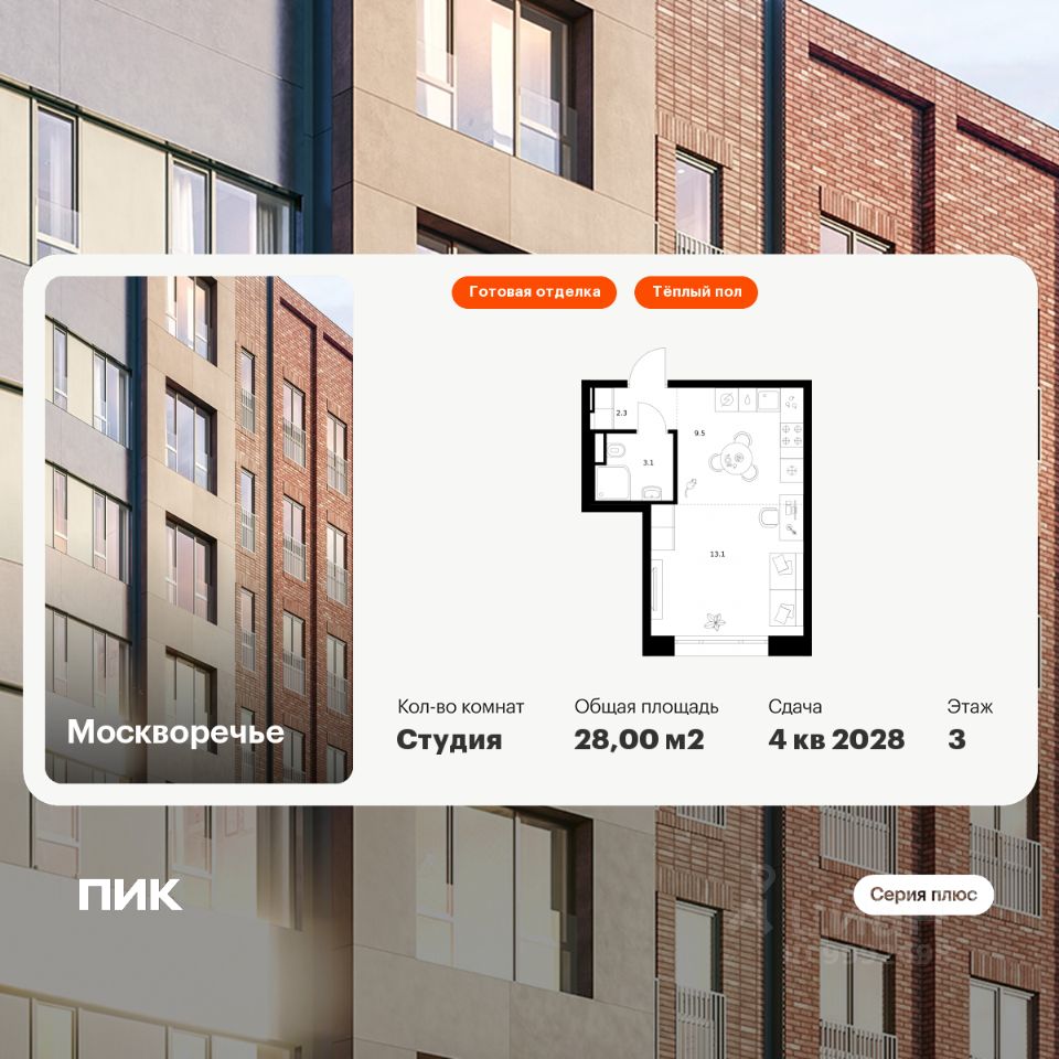Продаётся квартира-студия площадью 28 кв.м на 2 этаже 12 этажного дома (Корпус 2.3, Секция 3) проекта ПИК Москворечье. Светлый просторный подъезд на уровне земли, функциональная планировка, большие окна, c отделкой.