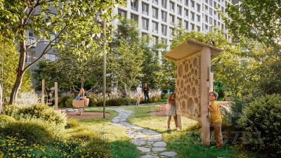 Юных жителей порадуют современные детские площадки, жукарий и специальное пространство для подвижных игр.