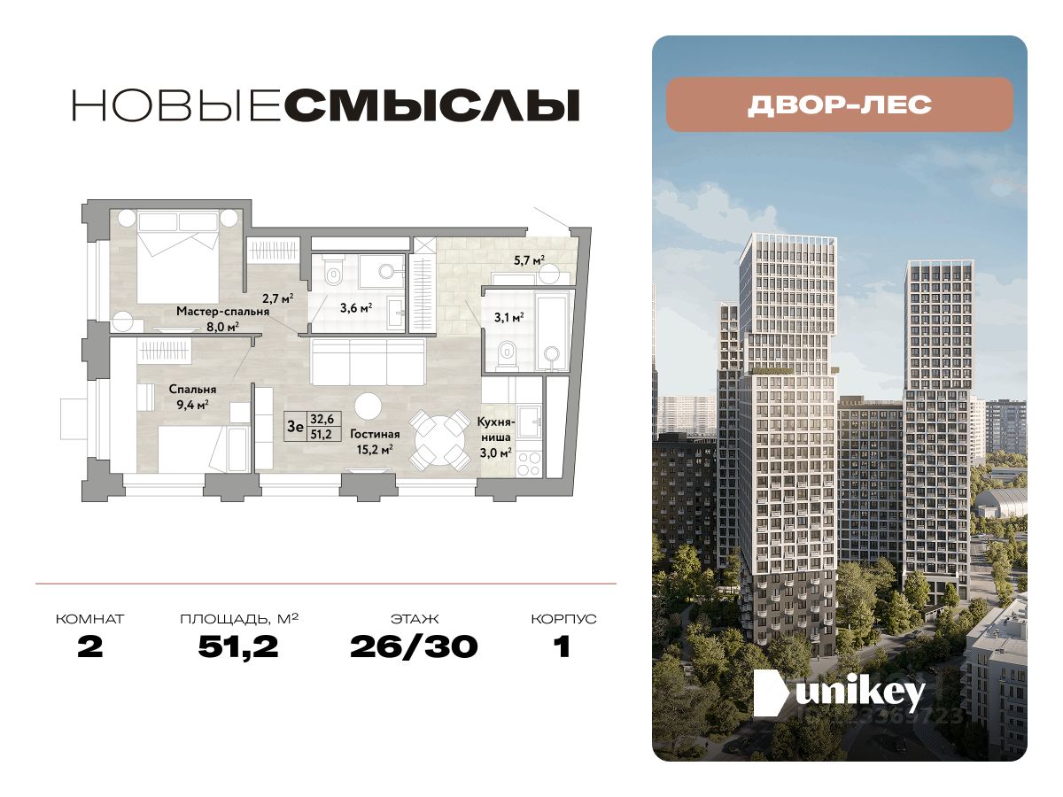 В жилом комплексе, расположенном по соседству с ландшафтным парком "Южное Бутово", продается 2-комнатная квартира площадью 51.20 кв. м. без отделки. Квартира расположена на 26 этаже 1 корпуса в жилом квартале комфорт-класса "Новые Смыслы" (ГК Unikey/Юникей).