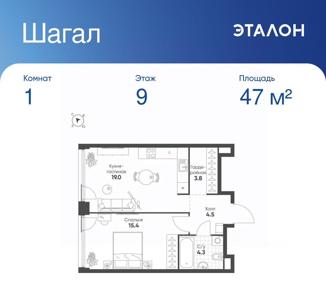 Общая площадь квартиры — 47 кв. м, этаж 9 из 13.