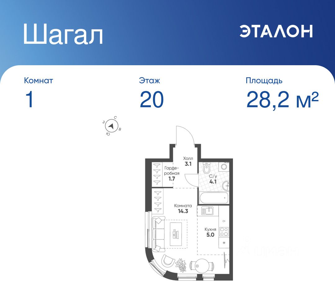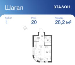 Общая площадь квартиры — 28.2 кв. м, этаж 20 из 26.