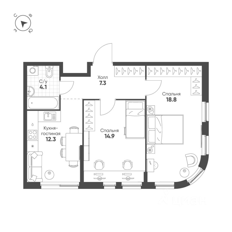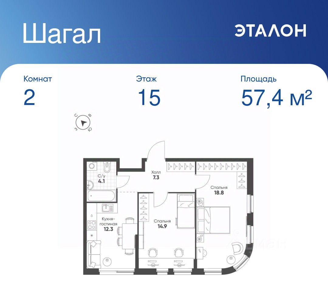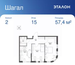 Общая площадь квартиры — 57.4 кв. м, этаж 15 из 26.