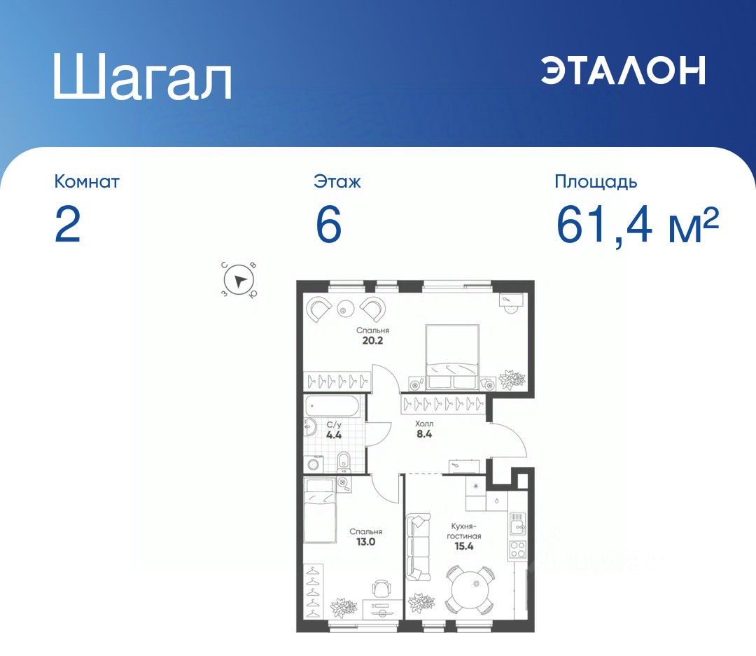 Общая площадь квартиры — 61.4 кв. м, этаж 6 из 14.