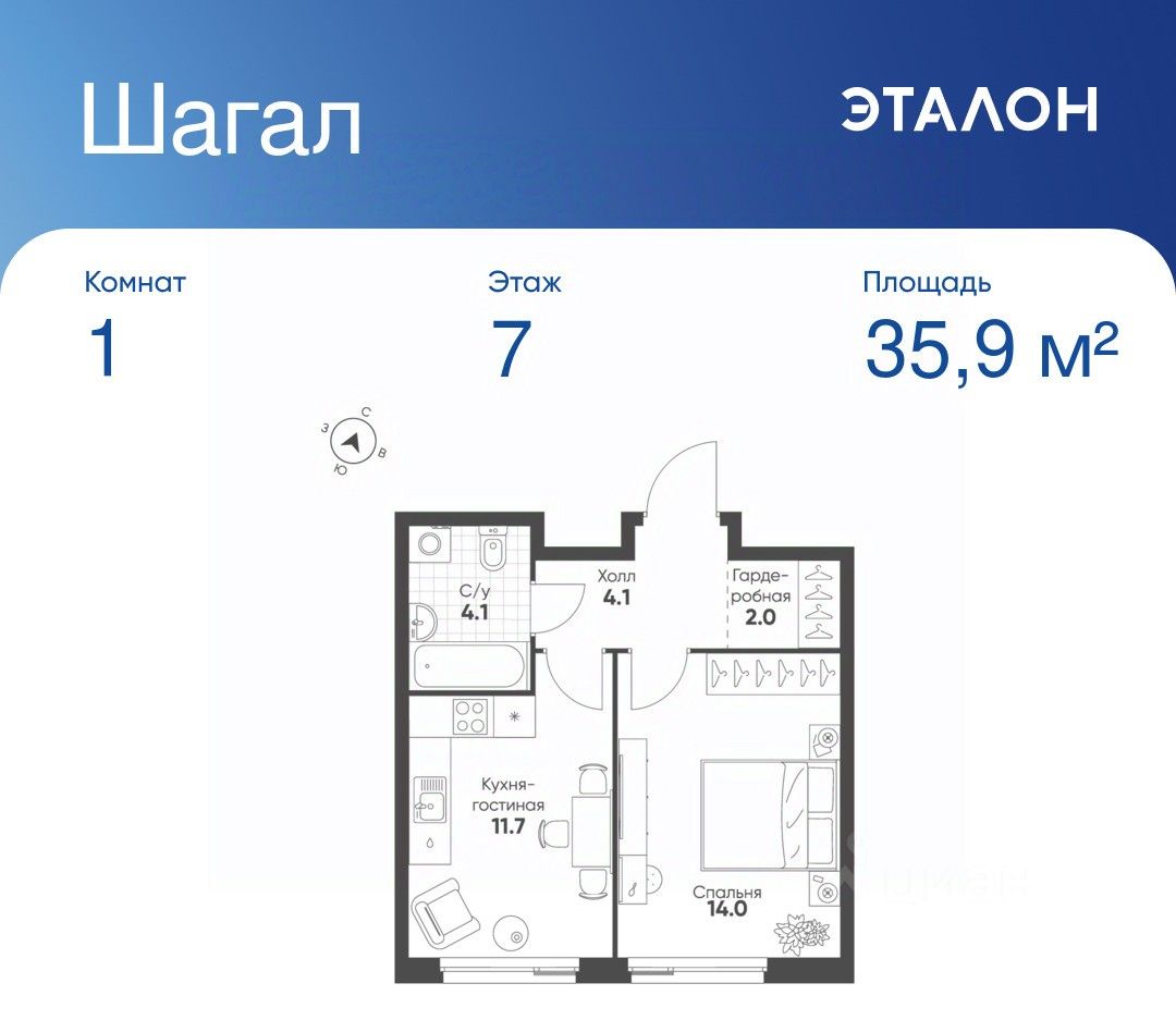 Общая площадь квартиры — 35.9 кв. м, этаж 7 из 8.