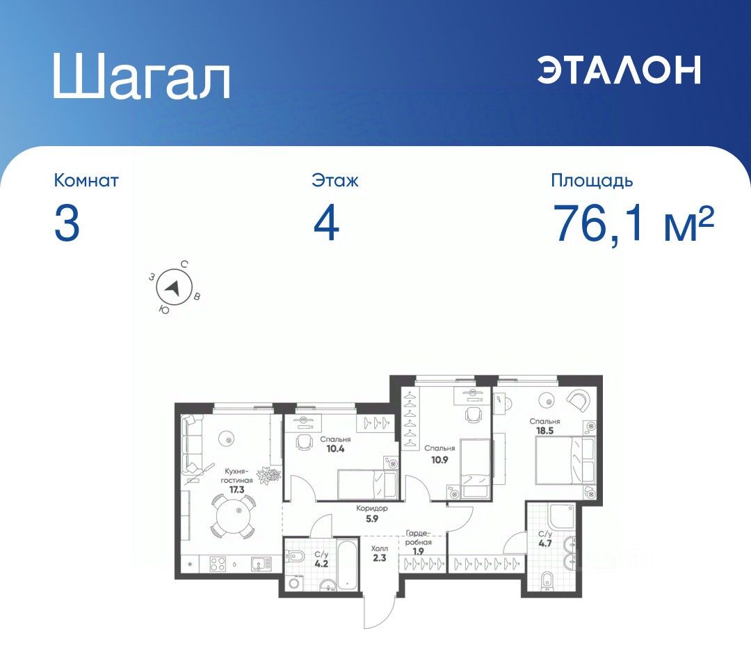 Общая площадь квартиры — 76.1 кв. м, этаж 4 из 8.