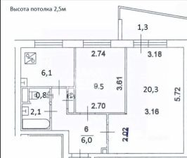 Общая площадь 45 кв.м., комнаты 9,5 и 20,9 кв.м., кухня 6 кв.м.