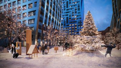 На первых этажах жилого комплекса откроются магазины, салоны красоты, фитнес-центр. Для детей строятся собственные детский сад и школа.