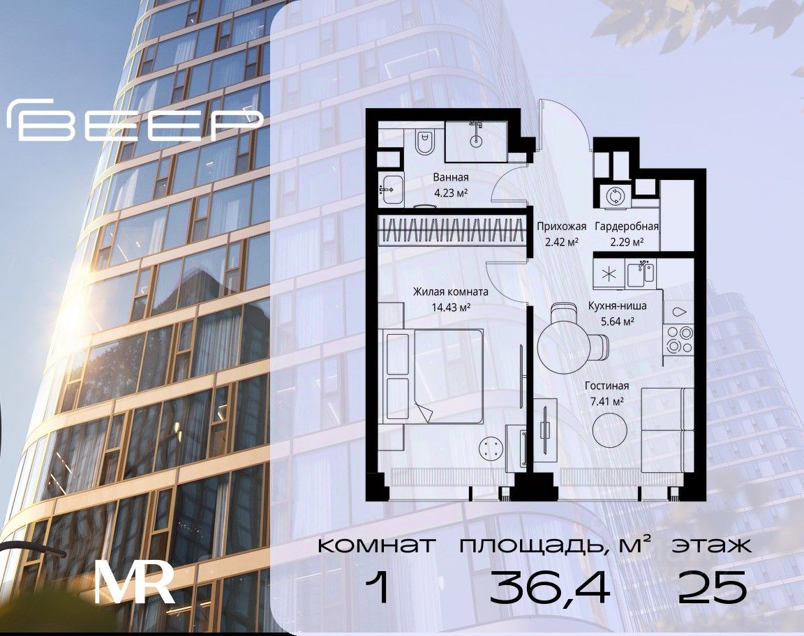 Продаётся 1-комнатная квартира общей площадью 36.42 м² без отделки в ЖК Веер на 25-м этаже 25 этажного дома.