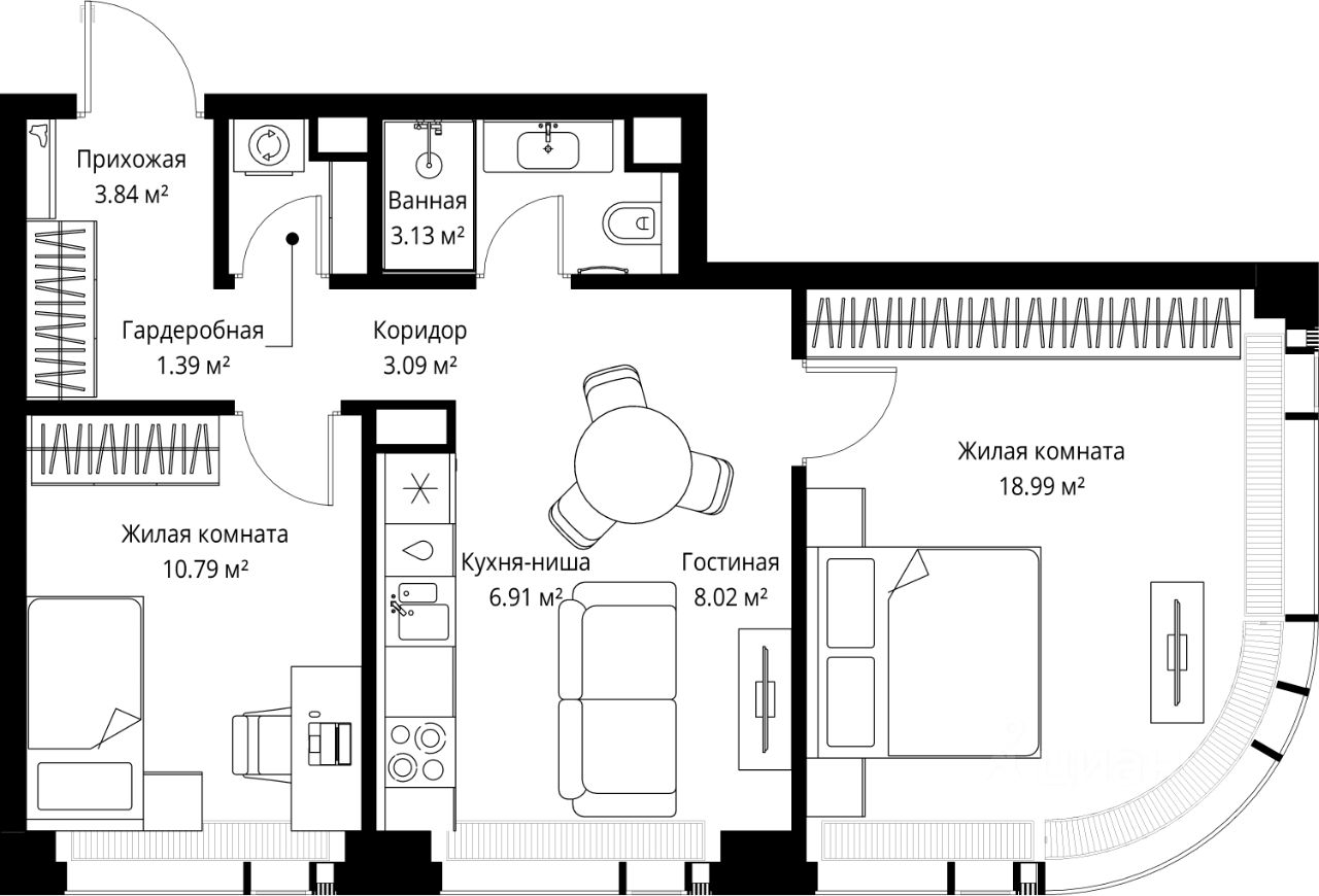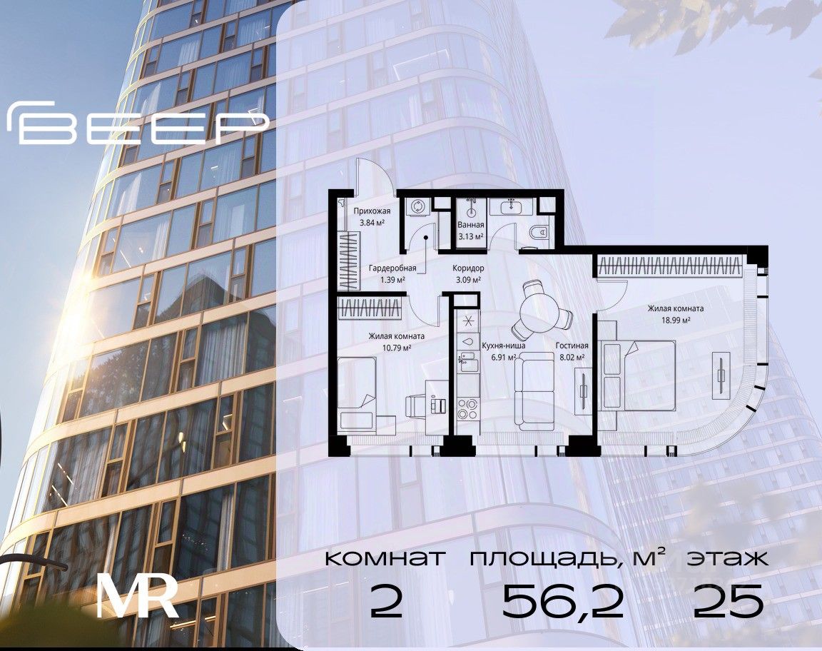 Продаётся 2-комнатная квартира общей площадью 56.16 м² без отделки в ЖК Веер на 25-м этаже 25 этажного дома.