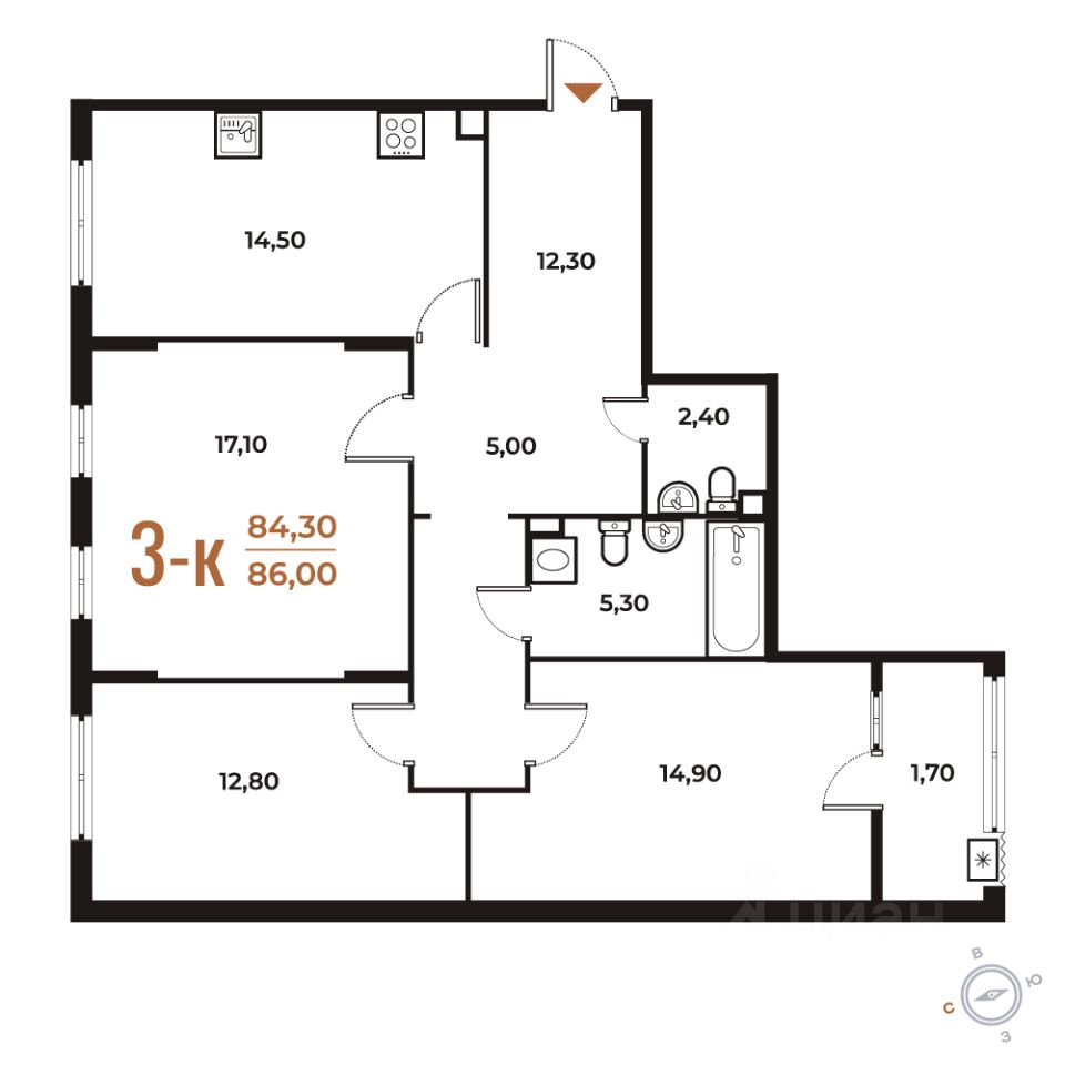 Общая площадь: 86.0 кв.м., жилая: 44.8 кв.м., площадь кухни: 14.5 кв.м. Этаж: 2, квартира 649.