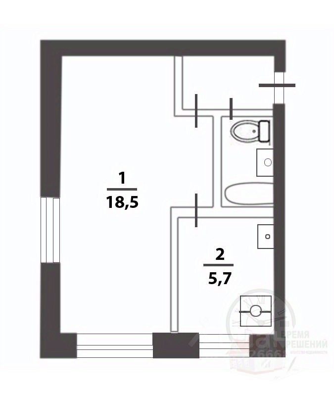 - Общая площадь: 30.1 кв.м, жилая - 18,5 кв.м, кухня 5,7 кв.м.