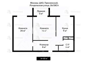Общая площадь квартиры — 58 м² (с учётом балкона площадь — 60 м²). С функциональной продуманной планировкой. Прихожая со встроенными шкафами. Санузел совмещённый с нишей для стиральной машины. Кухня площадью 9 м². Две изолированные комнаты: одна — 16 м² с выходом на остеклённый балкон с дверью "французское окно". Вторая комната — 20 м².