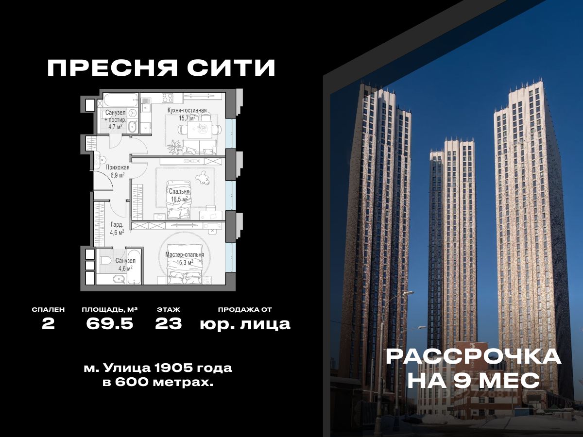 Продаётся двуспальная квартира, площадью 69,5 кв. м. на 23 этаже в ЖК "Пресня Сити".