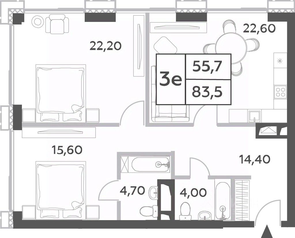 Общая площадь квартиры 83.5 м2 и высота потолков 3.1 м. Устанавливаются премиальные окна Schuco с панорамным остеклением с функцией проветривания, конвекторы в полу. Светлая двусторонняя квартира с 5-ю окнами с кухней-гостиной 23 м2 с двумя большими санузлами. Окна на юго-запад, северо-запад с окнами на закат и видами на город и Долину реки Сетунь. На каждом этаже есть технические балконы для установки системы кондиционирования.