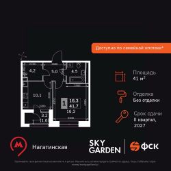 Продаётся 1-к квартира номер 206 общей площадью 41.7 кв.м. на 27-м этаже 29 этажного здания. Без отделки. Цена с учётом скидки.